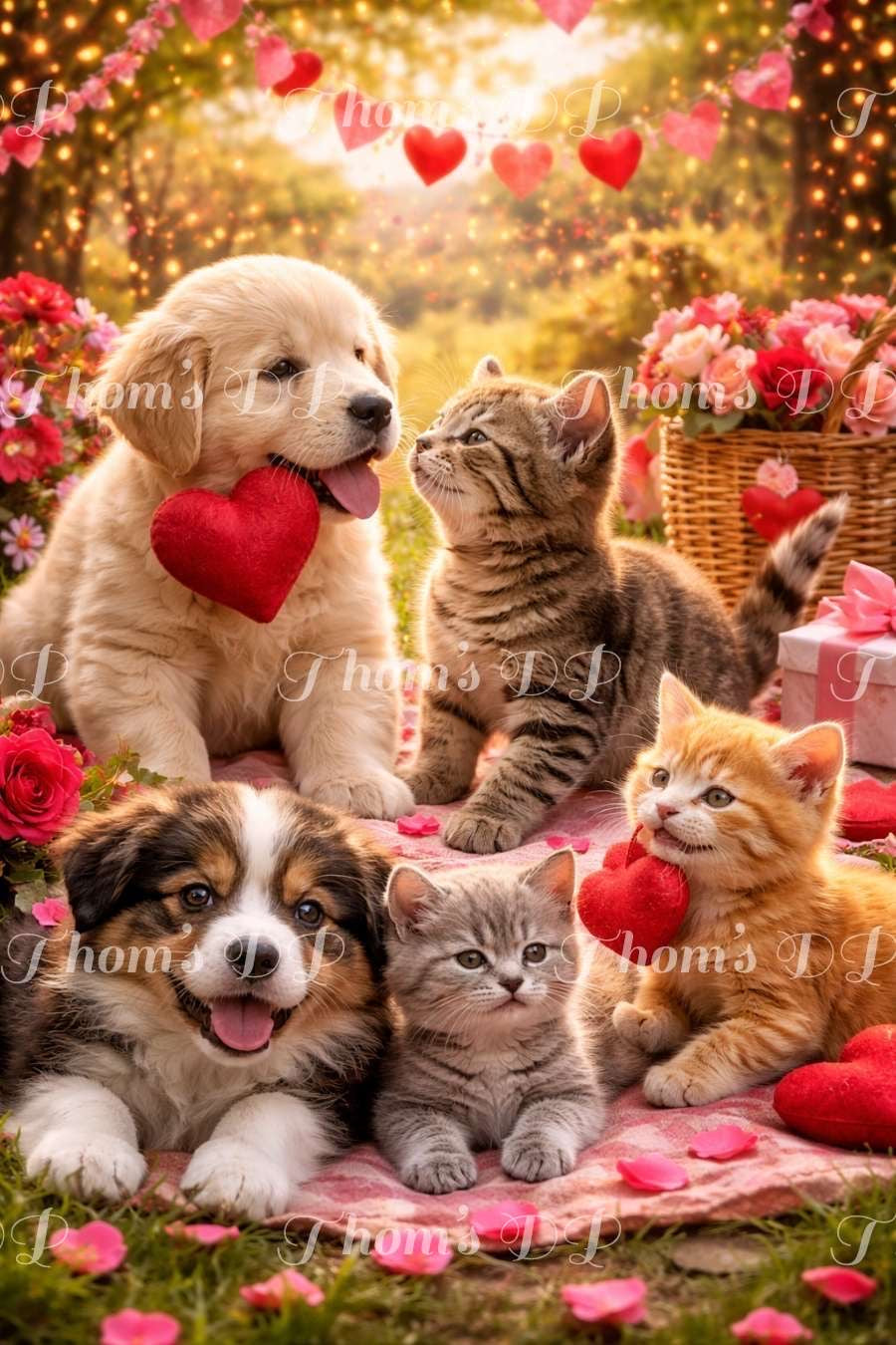 Un adorable groupe de chiots et de chatons réunis autour de cœurs rouges, symboles d’amitié et d’amour pur. Les expressions douces et joyeuses des animaux, les pétales de fleurs et les tons pastel créent une scène attendrissante.