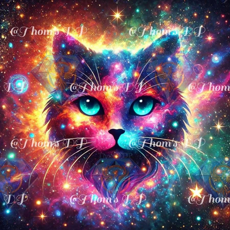 Un félin mystérieux émerge des profondeurs de l’univers. Son pelage cosmique, parsemé d’étoiles et de nébuleuses multicolores, brille de mille feux. Ses yeux turquoise hypnotisants semblent contenir tout l’infini des galaxies. Ce diamond painting fascinant séduira les amoureux des chats et des univers mystiques.