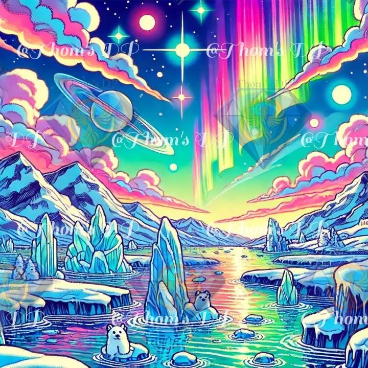 Un paysage surréaliste où l’univers et la glace ne font qu’un : des montagnes gelées, des ciels multicolores, des phoques curieux sous une pluie d’étoiles. “Rêves Arctiques” est un hommage poétique à la pureté des pôles et à l’immensité céleste.